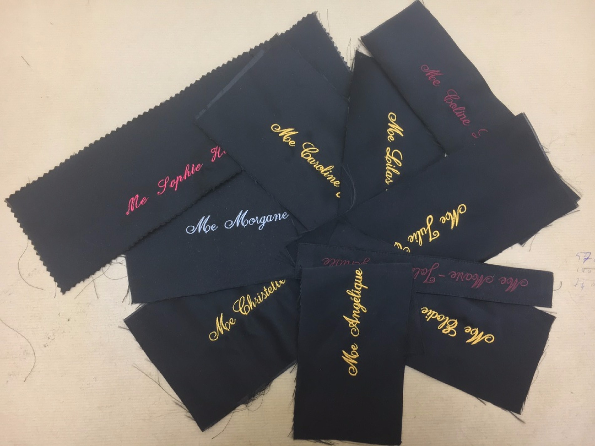 Votre nom et prénom brodés de fils de couleur ajoutent une élégance unique à votre robe. Bien plus qu’une simple identification, elles marquent votre vêtement d’une emprunte distinctive.